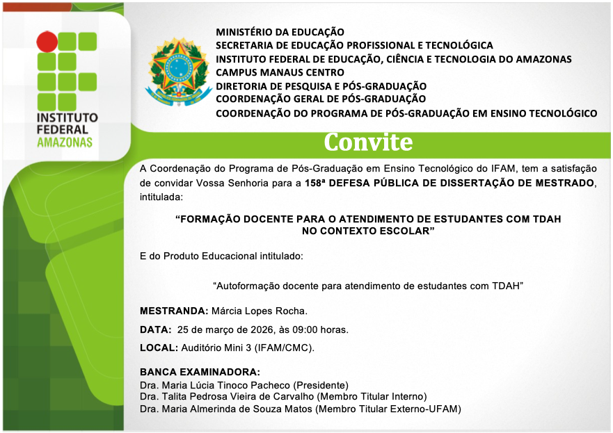 A Coordenação do Programa de Pós-Graduação em Ensino Tecnológico do IFAM, tem a satisfação de convidar Vossa Senhoria para a 158ª DEFESA PÚBLICA DE DISSERTAÇÃO DE MESTRADO, intitulada: