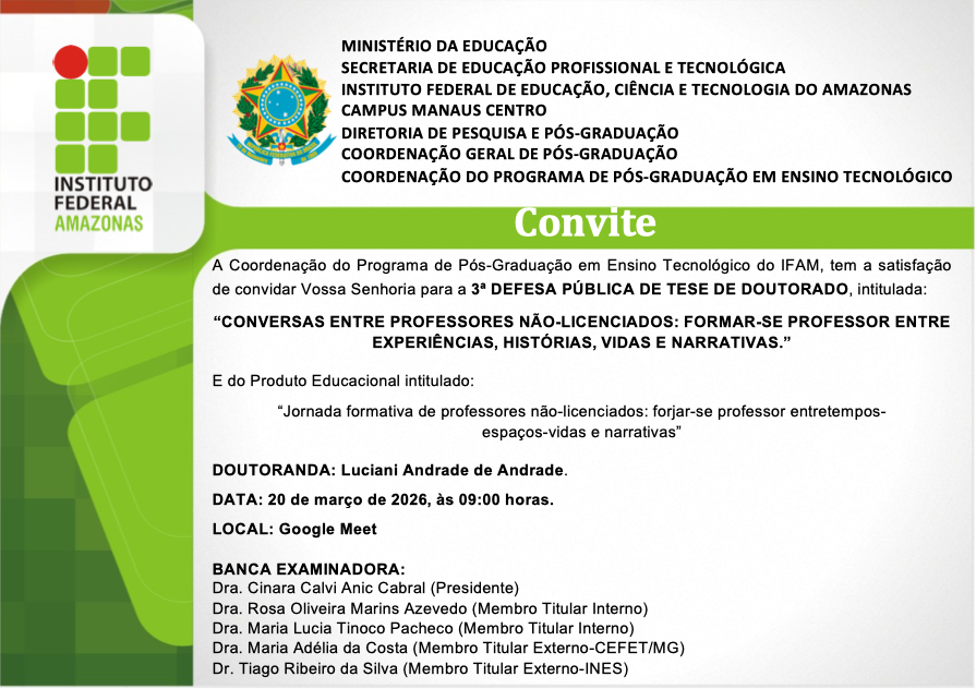 A Coordenação do Programa de Pós-Graduação em Ensino Tecnológico do IFAM, tem a satisfação de convidar Vossa Senhoria para a 3ª DEFESA PÚBLICA DE TESE DE DOUTORADO, intitulada: