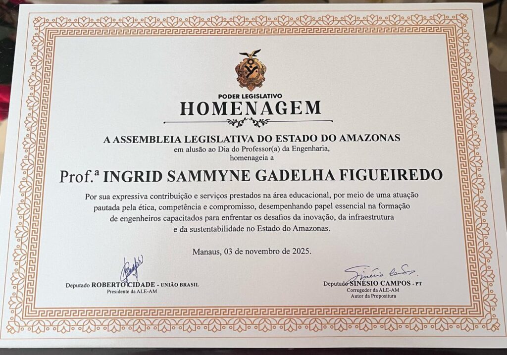 Na manhã da segunda-feira (03/11/2025), a doutoranda do PPGET e professora mestre Ingrid Sammyne Gadelha Figueiredo foi homenageada pela Assembleia Legislativa do Estado do Amazonas (ALE-AM), em Sessão Especial alusiva ao Dia do Professor(a) da Engenharia, proposta pelo deputado estadual Sinésio Campos (PT).