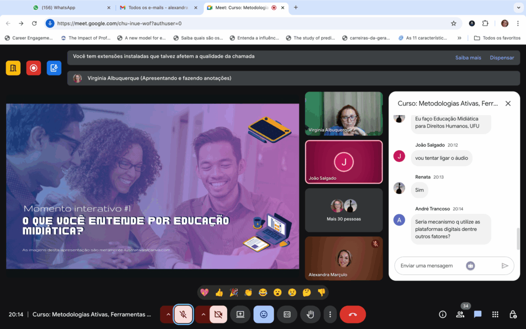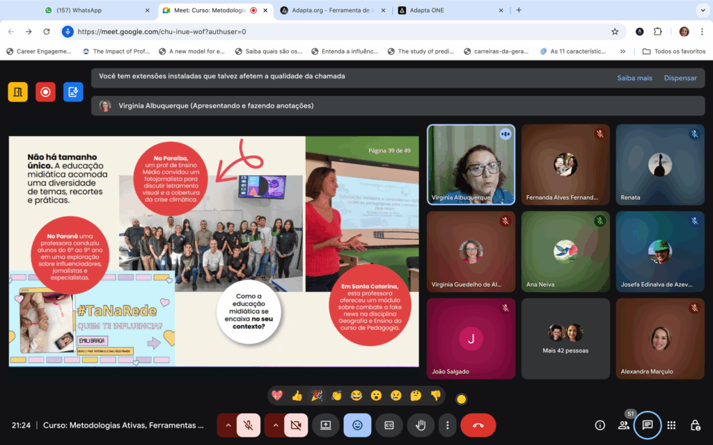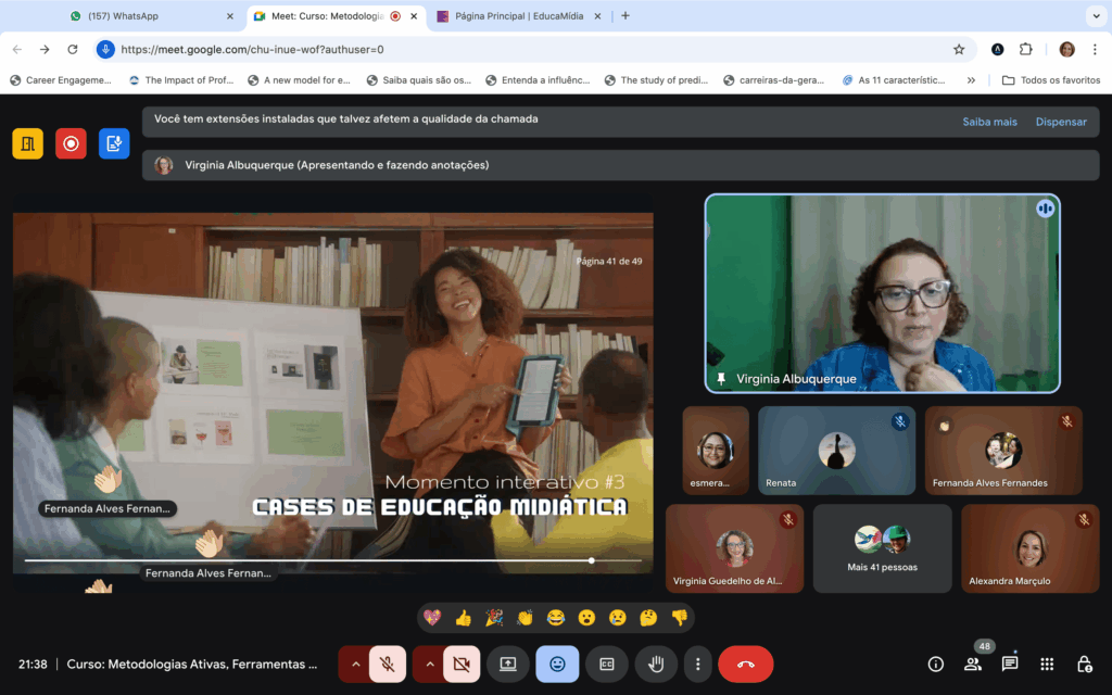 A atividade ocorreu no dia 03/11/2025, das 19h às 20h30, via plataforma Google Meet, e propôs uma reflexão sobre o papel da formação continuada de professores diante dos obstáculos e possibilidades para a implementação da Educação Midiática no currículo escolar, conforme explica Virginia. “A discussão buscou evidenciar como a presença das mídias, em especial as digitais, no cotidiano exige que o docente desenvolva competências críticas, criativas e éticas para integrar as tecnologias de forma significativa em sua prática pedagógica”, disse.