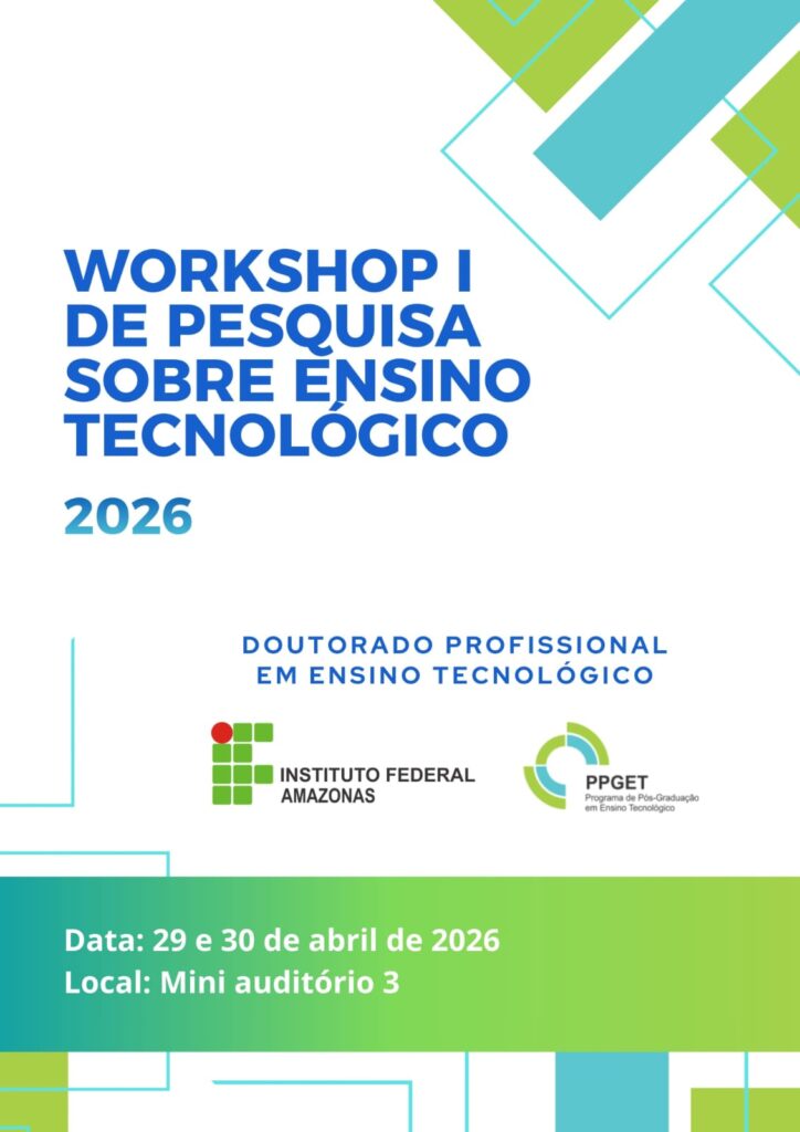 Nos dias 29 e 30 de abril de 2026, no mini auditório 3 do IFAM/CMC, será realizado o Workshop de Pesquisa sobre Ensino Tecnológico I, que contará em sua programação com uma mesa de abertura tratando sobre “A pesquisa em Ensino Tecnológico” com a participação da Profa. Dra. Cinara Calvi Anic Cabral e o Prof. Dr. José Anglada Rivera.
