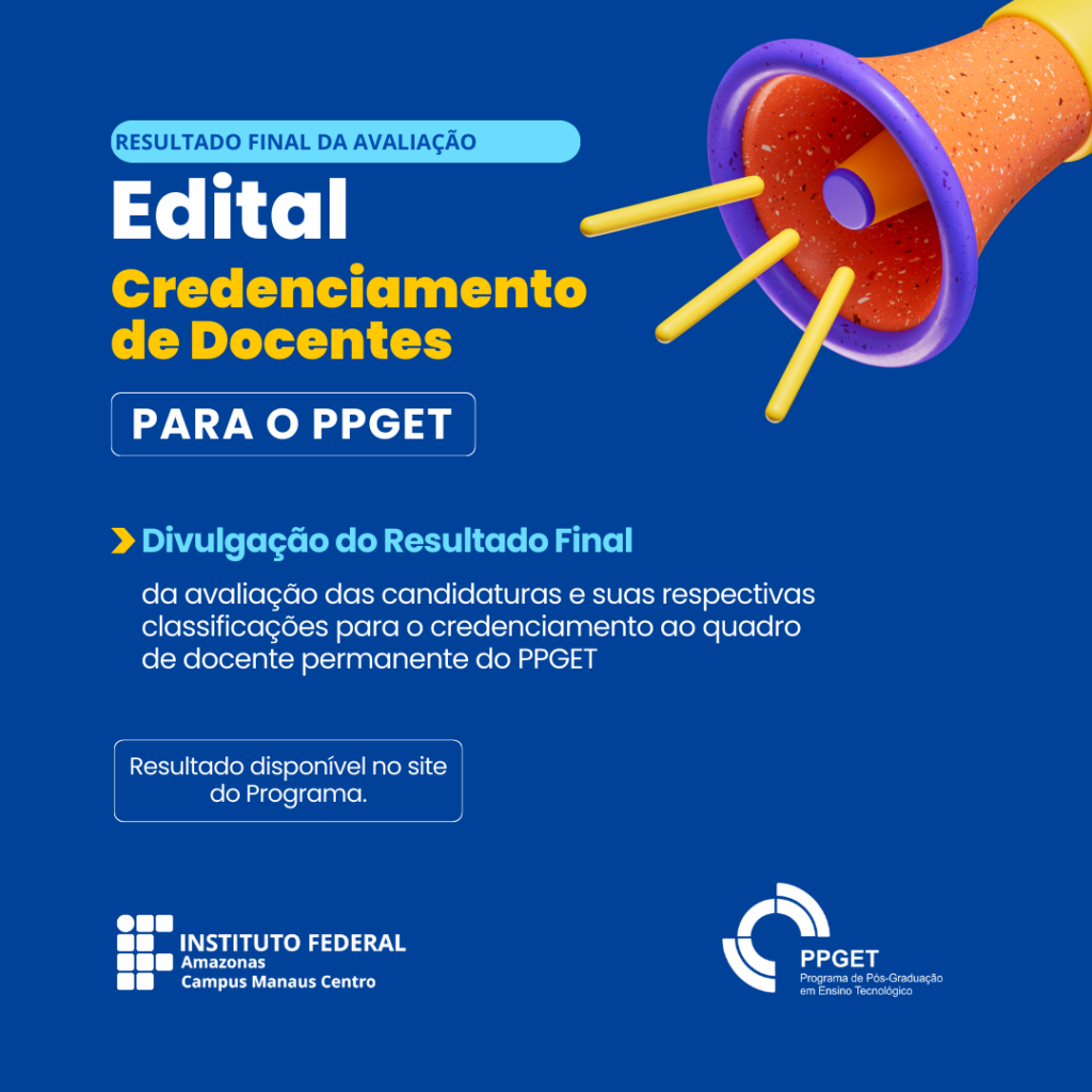 A Comissão de credenciamento, recredenciamento e descredenciamento do Programa de Pós-graduação em Ensino Tecnológico (PPGET) (Portaria Nº 811 – GAB/DG/CMC/IFAM, de 10.10.2025), no uso das suas atribuições, torna público o resultado final da avaliação das candidaturas e suas respectivas classificações para o credenciamento ao quadro de docente permanente do PPGET, do Instituto Federal de Educação, Ciência e Tecnologia do Amazonas (IFAM). Para acessar o resultado, clique aqui.