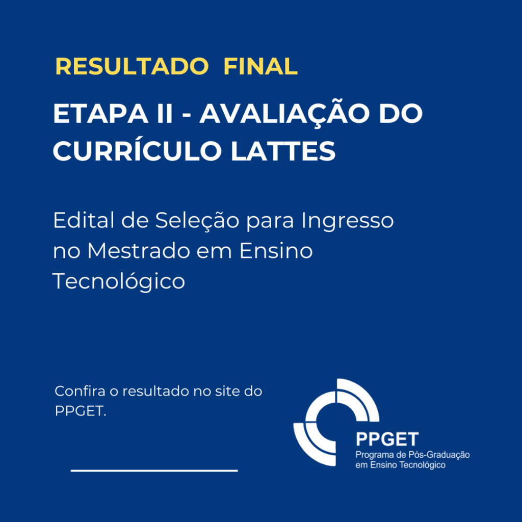Resultado Final dos Aprovados na Etapa II do Mestrado – Avaliação do Currículo Lattes. Para acessar o resultado, clique aqui.