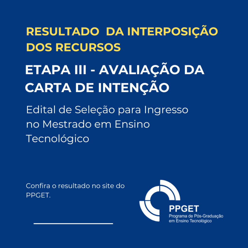 O resultado dos RECURSOS INTERPOSTOS NA ETAPA III do Mestrado – Avaliação da Carta de Intenção. Para acessar o resultado, clique aqui.