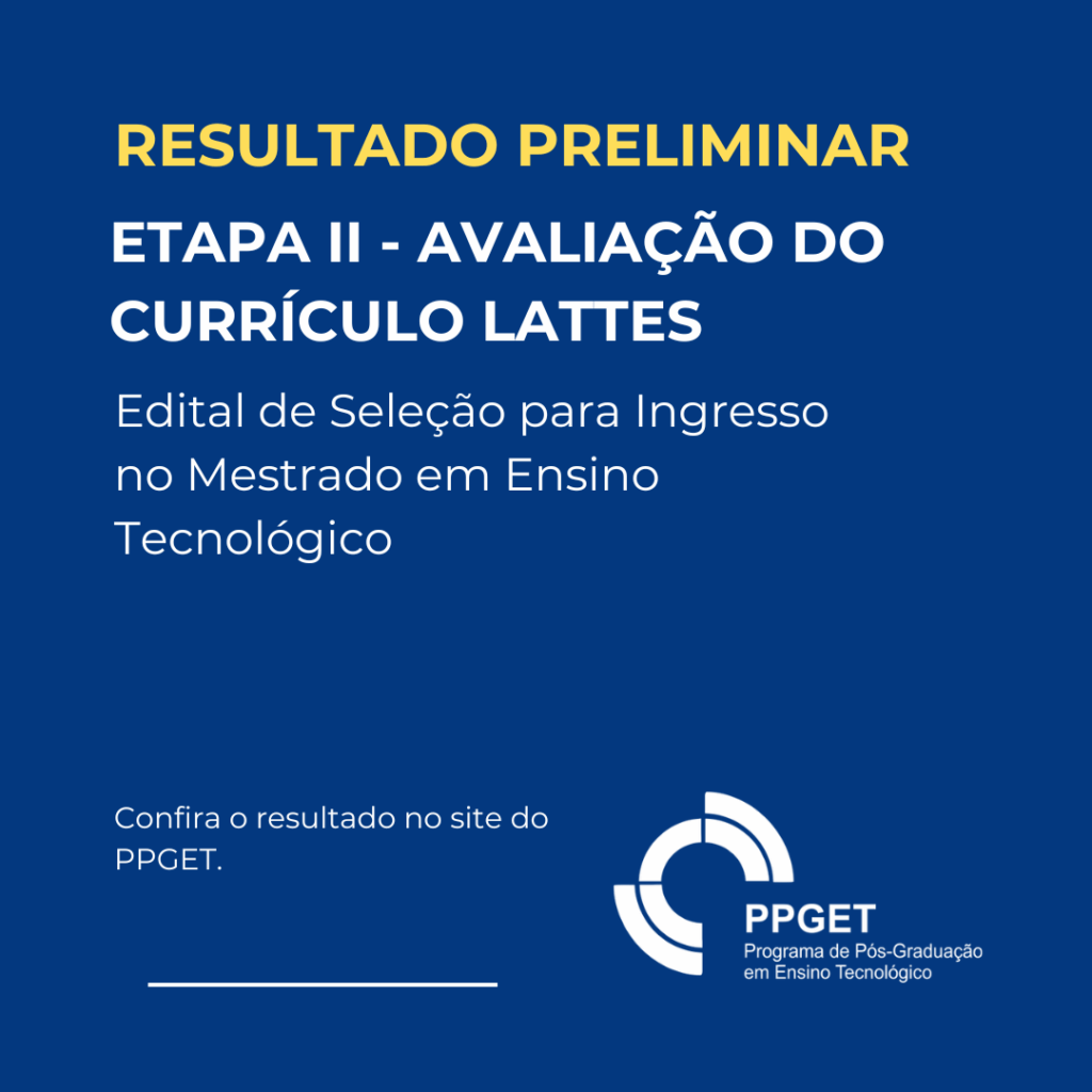O Instituto Federal de Educação, Ciência e Tecnologia do Amazonas (IFAM), por meio da Comissão do Processo Seletivo para o ingresso no Programa de Pós-Graduação em Ensino Tecnológico no curso de Mestrado Profissional em Ensino Tecnológico, Turma 2026, torna público o resultado preliminar dos aprovados na Etapa II – Avaliação do Currículo Lattes. Para acessar o resultado, clique aqui.